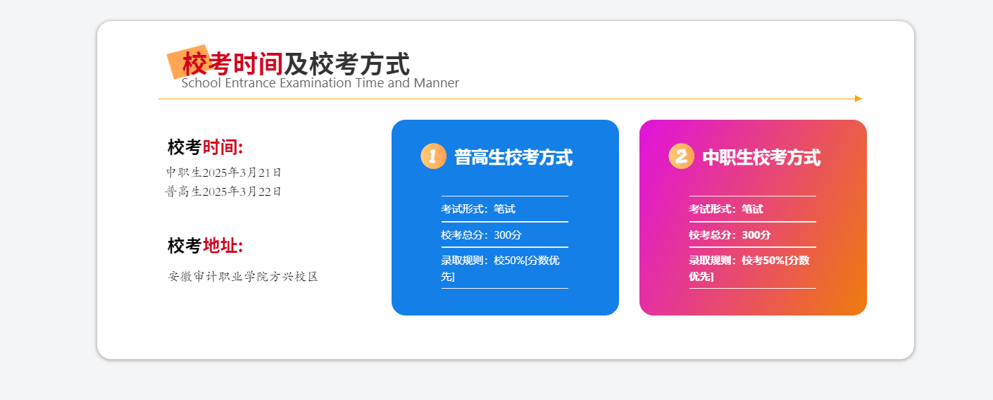 2。 校考要求:普高生加入职业顺应性测试,侧沉考查职业素养、行业认知及分析能力;中职生加入职业技术测试,侧沉专业技术实操取使用,具体测试纲领以学院官网发布为准。